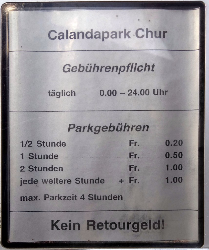 Tipp: Im Churer Calandapark “Migros” gibt´s ein gutes, reichhaltiges Frühstücksbuffet – natürlich inkl. Birchermüsli (das probiere ich bei der nächsten Tour!) – zu günstigem Preis! Auch der Betrag für´s Parkticket erstaunt: Da sind wir in deutschen Innenstädten deutlich andere Preise gewohnt…