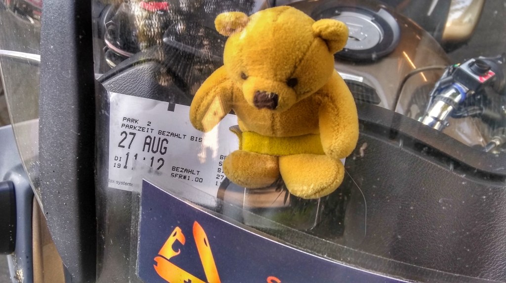 [Rainer] Aufgrund meiner nachhaltigen Erfahrungen mit Knöllchen in der Schweiz bezahle ich brav. Aber wo befestigt man das Parkticket am Motorrad so, dass der Wind oder ein klammer Zeitgenosse den Zettel nicht „verloren gehen“ lassen? Ich beschließe, dass der kleine Goldbär darauf aufpassen muss und schärfe ihm ein, den Zettel mit Zähnen und Tatzen zu verteildigen. Nur so rein vorsorglich mache ich ein Beweisbild. Man weiss ja nie 🙂